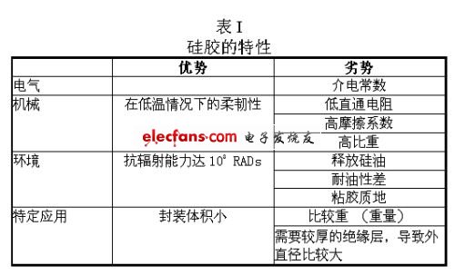 硅膠(表I)主要用于電纜護套,在低溫環(huán)境下仍能保持高柔韌性。但是,它易斷,而且其粘性表面會產(chǎn)生比較高的摩擦力,所以不適合潔凈室環(huán)境。硅膠的抗拉伸強度和抗撕裂強度比較低,因此使用此種材料制作的護套比其他材質(zhì)更厚??梢酝ㄟ^某些表面處理的方法降低摩擦系數(shù),但是隨著時間的推移,這些處理會被漸漸磨損掉。硅膠具有極好的耐輻射性,但是可用于制作電纜護套的硅膠等級已眾所周知,因為在真空應用中,比如熱真空艙的應用中,會產(chǎn)生硅油泄漏。如果還需要考慮重量因素,那么硅膠就不是最佳選擇。如果重點在于其柔韌性而不在于重量,則硅膠是一個理想選擇。但是,處理硅膠電纜內(nèi)的導體需要更多人工,從而導致更高的終端接頭裝配成本。