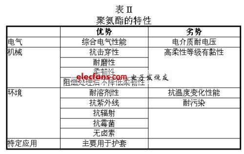 聚氨酯(表II)是一種很好的護套材料,但是由于耐電壓性能比其他材料低,而不用作絕緣。有無鹵素等級可供選擇。機械性上,聚氨酯柔性好,它非??箵舸⒖鼓p。對阻燃性的處理不會降低它的柔性,但是,柔性更好的等級往往有粘性或發(fā)粘,從而導致更高的摩擦系數(shù)。環(huán)境方面,聚氨酯抗溶劑、紫外線、輻射和霉菌。聚氨酯的溫度范圍不寬,在-40℃左右變得易碎,其溫度上限為100℃左右。而且聚氨酯不抗化學清洗劑。
