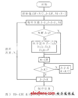 重新排序之前,存儲單元Y中依次存放輸入數(shù)據(jù),I表示當(dāng)前輸入數(shù)據(jù)比特的順序數(shù)的十進制數(shù)值,I的取值從0到N-I;J表示當(dāng)前倒序數(shù)的十進制數(shù)值。輸入序列的第一個和最后一個數(shù)的位置不需要倒序處理,完成倒序的外循環(huán)的次數(shù)為N-2。為了保證調(diào)換數(shù)據(jù)的正確性,需要檢測一下是否I