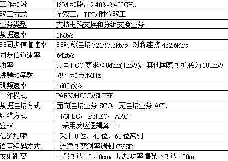 藍(lán)牙產(chǎn)品采用的是一種稱之為跳頻的技術(shù),能夠抗信號衰落;工作于2.4GHz的ISM (即工業(yè)、科學(xué)、醫(yī)學(xué))頻段,以省去申請專用許可證的麻煩;采用FM調(diào)制方式,使設(shè)備變得更為簡單可靠; "藍(lán)牙"的每一個話音通道支持 64kb/s的同步話音,異步通道支持的最大速率為721Kbps、反向應(yīng)答速率為57.6Kbps的非對稱連接,或者432.6kb/s的對稱連接。