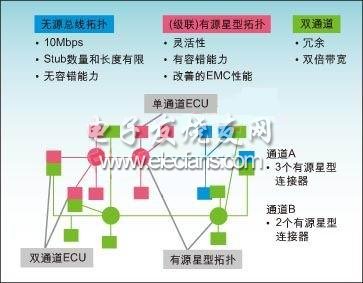 圖:FlexRay的設計支持多個網(wǎng)絡拓撲。