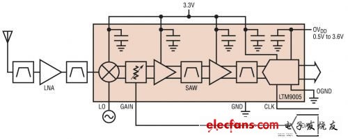 圖 2:在 LTM9005 微型模塊接收器中實(shí)現(xiàn)的 IF 采樣架構(gòu)