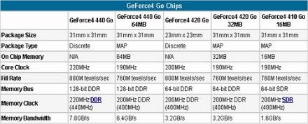 ?nVIDIA推出的GeForce4 4xx Go系列移動顯卡,其中包括Geforce 4 460 Go、 Geforce 4 440 Go、Geforce 4 420 Go和Geoforce 4 410 Go等幾個系列的產品,代號NV17。這些產品都是由桌面版GeForce4 MX核心改進而來的,所以它們都擁有Accuview AA引擎、T&L 引擎、和對nView的支持。不過由于進行了簡化核心,所以除了GeForce4 460其它顯卡都不具備nfiniteFX 引擎,無法支持DirectX 8,這使得它們與Mobility Radeon 7500處于同一起跑線上,因為M7同樣最高支持到DirectX 7。