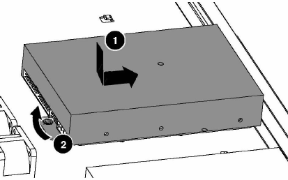 沿著機(jī)箱使鎖扣與固定器對(duì)齊,然后壓下 CD-ROM 閂鎖 (2)。