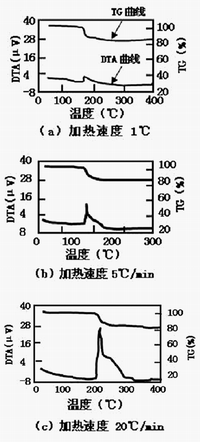 這種納米粒子的功能在其有機(jī)外殼熱分解去除后便展示出來。圖5顯示了銀納米粒子的熱分析結(jié)果(DTA/TG曲線)。從DTA曲線來看,在發(fā)熱反應(yīng)開始的同時(shí),粒子質(zhì)量迅速減少,可以認(rèn)為這時(shí)的有機(jī)外殼已被分解與去除。而且,當(dāng)提升加熱速度時(shí),分解溫度則向高溫側(cè)移動。圖6顯示了分解結(jié)束溫度與加熱速度的關(guān)系,從圖可知,即使把加熱速度加快到20℃/m,分解也在 265℃左右結(jié)束,在300℃以下出現(xiàn)納米粒子的功能。也就是說,在300℃以下可利用該納米粒子進(jìn)行連接。