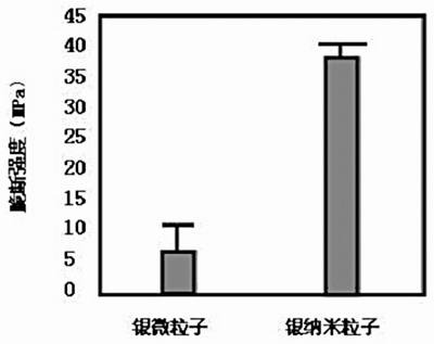 日本大阪大學(xué)應(yīng)用銅質(zhì)圓板型試驗(yàn)片作銀納米粒子連接試驗(yàn),分別測出了銀微米粒子(平均粒徑為100nm)和銀納米粒子的脆斷強(qiáng)度(見圖7)。其中,該試驗(yàn)是在300℃、保溫300min、加壓5Mpa的條件下進(jìn)行的。如圖7所示,納米粒子連接與微粒子連接相比,顯示出了很高的脆斷強(qiáng)度。