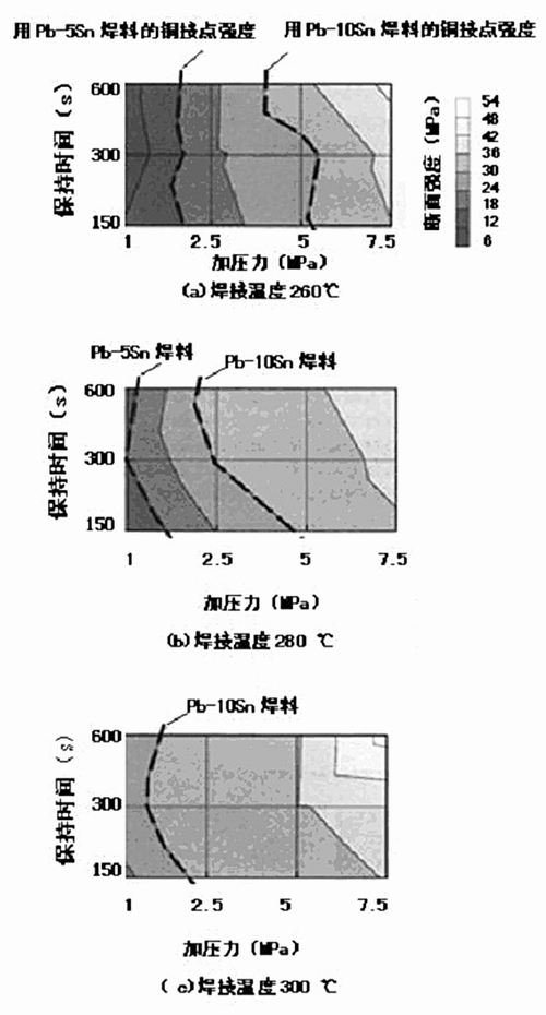 在現(xiàn)行富鉛高溫焊料液相溫度(300℃、315℃)以下的溫度范圍內(nèi)(260℃~300℃),銀納米粒子焊接工藝可以使用。圖10是連接條件與強(qiáng)度的關(guān)系。圖中虛線是富鉛焊料Pb-5Sn、 Pb-10Sn與Cu圓板型接頭的斷面強(qiáng)度(分別為18Mpa,30MPa),實(shí)線則代表銀納米粒子連接的斷面強(qiáng)度。由圖可知,銀納米粒子不僅有與Pb-5Sn相匹敵的強(qiáng)度,而且可以在低溫、低壓等較寬的連接條件下使用。其次,無論是升溫還是增壓,銀納米粒子連接的斷面強(qiáng)度都是其他兩者無可比擬的。而且,該連接的連接處有高熔點(diǎn),所以在隨后的2次焊接等熱工藝中不會熔化。另外,就芯片鍵合部所要求的電氣傳導(dǎo)度和熱傳導(dǎo)性而言,由于連接處是由金屬銀形成的,所以一定比現(xiàn)行高溫焊料的特性還要好。