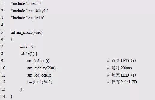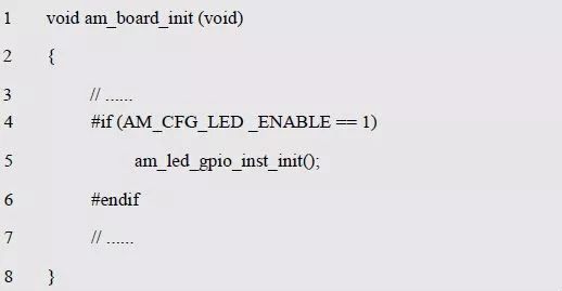 如果用戶(hù)不需要使用LED,為了節(jié)省內(nèi)存空間,可以將工程配置文件(am_prj_config.h)中的AM_CFG_LED_ENABLE 宏值修改為0,裁掉LED 程序,該宏本質(zhì)上控制了板級(jí)初始化函數(shù)中的一段程序,詳見(jiàn)程序清單7.8。