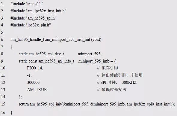 若使用LPC824 的SPI0 驅(qū)動(dòng)HC595 輸出,則通過(guò)LPC82x 的SPI0 實(shí)例初始化函數(shù)am_lpc82x_spi0_inst_init()獲得SPI 句柄。即: