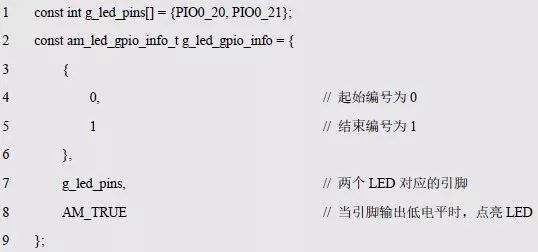p_pins 指向存放各個(gè)LED 相應(yīng)引腳號(hào)的數(shù)組,比如,AM824-Core 開(kāi)發(fā)板的LED0 通過(guò)J9 與MCU 的PIO0_20 相連,LED1 通過(guò)J10 與MCU 的PIO0_21 相連?;诖耍x一個(gè)存放引腳號(hào)的數(shù)組。比如: