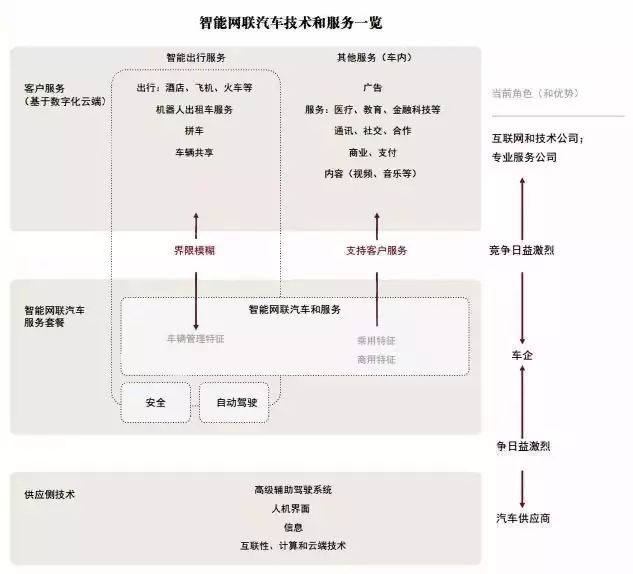 ? 消費者服務(wù)。消費者服務(wù)包括基于互聯(lián)網(wǎng)和云端的數(shù)字化服務(wù),有助于提升駕駛體驗。其中包括一般互聯(lián)網(wǎng)服務(wù),如娛樂、電商、社交平臺和健康(原本在車外開展的活動),這些服務(wù)在未來可能依然由當(dāng)前的服務(wù)供應(yīng)商提供。其他為“智能出行服務(wù)”,專門針對汽車出行,很可能與汽車?yán)墸ㄆ窜?、汽車共享和?dǎo)航相關(guān)服務(wù)(如找到最近的酒店并預(yù)訂房間)。生產(chǎn)銷售品牌汽車的諸多領(lǐng)先車企在這些領(lǐng)域投入了大量的資金開展創(chuàng)新和并購活動。但將來,車企除了作為必要的車內(nèi)互聯(lián)服務(wù)和屏幕供應(yīng)商之外還將扮演什么樣的角色,目前尚不得而知。