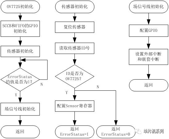 攝像頭OV7725的初始化分為三大部分:SCCB總線和FIFO的GPIO初始化,傳感器的初始化,場信號線的初始化。其中的SCCB總線時(shí)序在上一章已經(jīng)講過,圖3.5是OV7725初始化的程序流程圖。