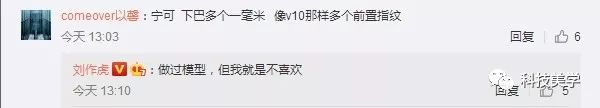 有網友在一加CEO劉作虎微博下評論:“寧可下巴多個一毫米,像v10那樣多個前置指紋”,劉作虎回應稱:“一加5T做過前置指紋的模型,但是使用后不喜歡”。