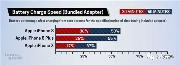 接下來是iPhone X/8/8 Plus,總體成績相仿,半小時最多50%,1小時基本達到80%。