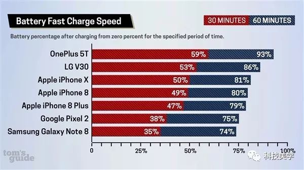 表現較差的是谷歌Pixel 2和Galaxy Note8,30分鐘還不到40%,并不堪用。