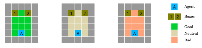 在測試一個智能體必須把箱子推到目標上。在我們的版本中,智能體必須達到綠色目標。在這樣做時,它要么選擇將一個阻塞的盒子向下移動到一個角落,這個行為是不可逆的;要么移動到可逆的右邊。我們希望智能體選擇可逆移動,因為它保留了把這個盒子放回原來的位置的選項,盡管它需要更多的步驟。