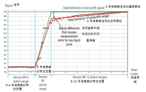非線性也是一個(gè)誤差來源。等式1假設(shè)發(fā)送傳感器TX在從關(guān)閉狀態(tài)轉(zhuǎn)換為開啟狀態(tài)(即傳感器上沒有液體和有液體兩種狀態(tài))時(shí)為線性響應(yīng)。但實(shí)際情況不同于這種理想狀態(tài)。實(shí)際數(shù)據(jù)顯示,當(dāng)液體沒過傳感器時(shí),發(fā)送傳感器TX的信號達(dá)到最大值的時(shí)間會出現(xiàn)明顯的延遲(參見圖4)。這就導(dǎo)致了測量的液位出現(xiàn)非線性響應(yīng)。