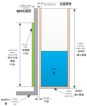 傳感器PCB由互電容傳感器組成,裝在咖啡機(jī)的隔板中,而隔板與儲水容器之間存在空隙(參見圖2)。傳感器的發(fā)送器和接收器位于其主板上,液體會改變它們之間的互電容。