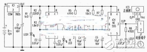 接收器部分由紅外線接收模塊Ic3、555單穩(wěn)觸發(fā)器IC4和LED指示器組成。根據(jù)收到的紅外信號,Ic4觸發(fā)導(dǎo)通,并在接收紅外信號的周期內(nèi)維持導(dǎo)通。當(dāng)信號中斷時(shí),單穩(wěn)電路IC4在幾秒鐘后關(guān)閉,具體時(shí)間由定時(shí)元件R7和C6確定(T=1.1R7×C6)。因此,若R7=470kΩ,C6:4.7μF,則單穩(wěn)周期約為2.5秒。