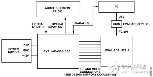 本電路利用ADAV801/ADAV803評估板(EVAL-ADAV801EBZ或 EVAL-ADAV803EBZ) 和ADAU1761 (EVAL-ADAU1761Z)評估板進(jìn)行測試。關(guān)于評估板之間的必需連接和鏈路配置,請參閱設(shè)計(jì)支持文檔。圖2所示為使用兩個(gè)評估板的完整測試設(shè)置。