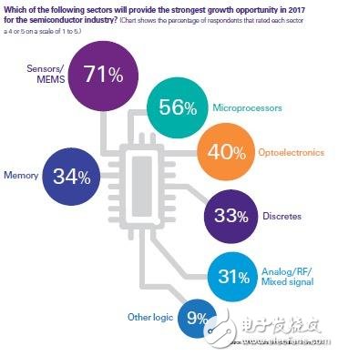 雖然通信和計算機(jī)一直是傳統(tǒng)的、可靠的終端市場,但2017年的報告展示了新的機(jī)會。物聯(lián)網(wǎng)、汽車、消費(fèi)電子和工業(yè)都將無線通信作為最重要的銷售驅(qū)動因素。在產(chǎn)品類型方面,傳感器和MEMS增長潛力最大,其次為微處理器和光電子。