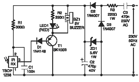 本電路用于檢查一個(gè)紅外遙控器的基本操作的理想選擇。該電路是基于壓電蜂鳴器直接連接到一個(gè)紅外線接收器IC精辟簡(jiǎn)單的想法。紅外遙控器 測(cè)試儀 原理圖: