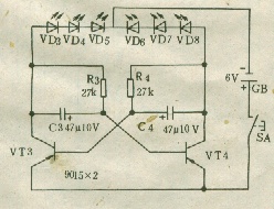 在多諧振蕩器兩只三極管的集電極分別接上發(fā)光管,發(fā)光管就能夠依多諧振蕩器的周期進(jìn)行交替閃爍,此電路用途廣泛,可用與家居裝飾等。