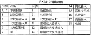 RX3310A是***HMARK公司生產(chǎn)的專門用于幅度鍵控ASK調(diào)制的無線遙控及數(shù)傳信號(hào)的接收集成電路,內(nèi)含低噪音高頻放大、混頻器、本機(jī)振蕩、中頻放大器、中頻濾波器、比較器等,為一次變頻超外差電路,雙列18腳寬體貼片封裝,主要技術(shù)指標(biāo)如下: