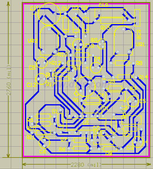 另外,在本電路的電路板制作時(shí),站長(zhǎng)忘記了在板中央留一個(gè)擰螺絲的位置,所以電路板做好后只好用膠粘在盒里固定。還有,電路原理圖上有一個(gè)R? 1K的電阻是我在作圖時(shí)不小心加上的,實(shí)際上沒(méi)有這個(gè)電阻。
