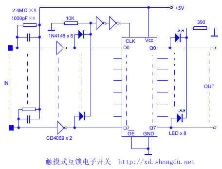 工作原理見下圖,74LS374有一特性,即在CLK上升沿(由0至1)時,能把D端狀態(tài)鎖存到Q端;而利用CD4069反相器的輸入高阻特性,實現(xiàn)觸摸操作。