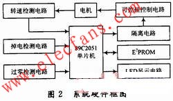 硬件電路設(shè)計(jì)框圖如圖2所示。單片機(jī)為控制器的核心部件,其主要工作是接收220 V交流電的過(guò)零信號(hào),根據(jù)過(guò)零檢測(cè)信號(hào)控制可控硅的導(dǎo)通時(shí)間;接收掉電檢測(cè)電路送來(lái)的掉電信號(hào);檢測(cè)電機(jī)轉(zhuǎn)速等級(jí)并在數(shù)碼管上顯示。
