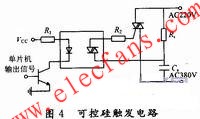 導(dǎo)通控制電路通過(guò)帶光隔離的雙向可控硅驅(qū)動(dòng)器MOC3052驅(qū)動(dòng)可控硅,實(shí)現(xiàn)單片機(jī)對(duì)控硅的導(dǎo)通控制,從而達(dá)到轉(zhuǎn)速控制的目的。可控硅觸發(fā)電路如圖4所示。