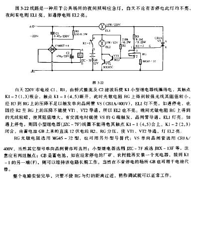 它是在普通應(yīng)急燈電路的基礎(chǔ)上加裝光控電路而組成的,圖中虛線框以外為普通應(yīng)急燈電路,虛線框內(nèi)為加裝的光控電路。在室內(nèi)光線突然由亮變暗時,該電路可自動將應(yīng)急燈點亮,1min后應(yīng)急燈自動熄滅,以便停電時能及時找到應(yīng)急燈。