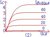 例2:如圖(2)所示電路,已知Rb=280千歐,Rc=3千歐,Ucc=12伏,三極管的輸出特性曲線如圖(3)所示,試用圖解法確定靜態(tài)工作點。 | |