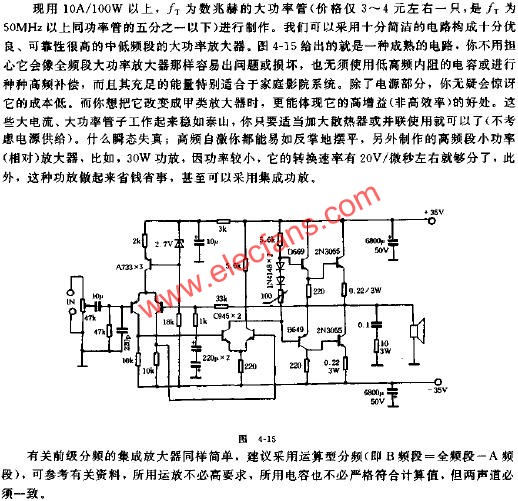 音響發(fā)燒友中流行的大功率放大器中使用FT高的大功率管,在功率越做越大的情況下,為此必須付出較大的代價(jià),這不僅指在經(jīng)濟(jì)上付出,而且包括由此引起不易解決好的自激對(duì)音質(zhì)的破壞及對(duì)靠性的威脅。其實(shí),我們只要把占能量約70%的中低頻段和占30%的高頻段分別做成功放,就完全能解決上面的問(wèn)題。這就是“前級(jí)分頻”或“電子分頻”功放。