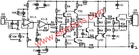 用日本“ROHM”系列晶體管構(gòu)成的純DC功放原理如下圖所示。部分ROHM管性能參數(shù)和本功放特性如下表所示。輸入信號經(jīng)C2、R1低通處理后送往IC1A作緩沖放大,再由IC1B及VT1~VT4組成的電壓放大級分別作5倍、8倍的電壓放大,然后將信號送入VT6、VT7構(gòu)成電流推動級,最后由VT8、VT9完成功率放大。IC選用正宗NE5532,VT1、VT2用FT高達500MHZ的C556、C546,這對提高放大器瞬態(tài)響應(yīng)起著至關(guān)重要的作用。VT3~VT9均用"ROHM“公司的中大功率管。特別是VT5用中功率管系列,能良好地對大功率管的溫度進行跟蹤。更有效地對功放因溫升而引起的工作點漂移予以校正。電路裝好經(jīng)檢查無誤后即可通電,調(diào)節(jié)R28使R28兩端壓降為5~8MV,然后將其換成同阻值固定電阻即可(此時VT8、VT9靜態(tài)電流為20~32MA)