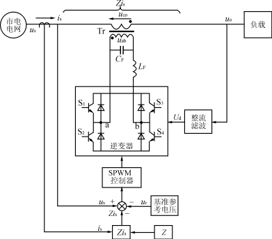 采用PWM高頻逆變器的補償式交流穩(wěn)壓電源的原理電路如圖所示。其中補償電壓uco由單相全橋逆變器產(chǎn)生(也可以采用半橋式或推挽式逆變器),逆變器采用高頻SPWM調制。單相全橋逆變器的輸出電壓uab通過輸出變壓器Tr,把電壓uab變成補償電壓uco在Tr的次級輸出。Tr的次級串聯(lián)在主電路中以對市電電壓的變化進行補償,保持輸出電壓uo穩(wěn)定不變。圖中LFCF為低通濾波器,以濾掉逆變器輸出電壓uab中的高次諧波。變壓器Tr次級繞組的電阻和漏感以及市電電源內阻共同組成線路阻抗Z,則當負載變化時在Z上產(chǎn)生的壓降會使輸出電壓隨之變化。ur為用正弦電壓發(fā)生器和鎖相環(huán)產(chǎn)生的標準參考電壓,鎖相環(huán)是使ur在相位上與市電電壓us同步。