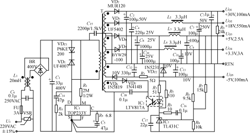 69 由TOP246Y構(gòu)成的45W多路輸出式開關(guān)電源的電路如圖所示。它可作為機頂盒、電報譯友器、大容量硬盤驅(qū)動器或筆