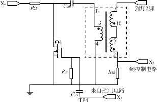 圖4是金鹵燈起動(dòng)電路(也叫觸發(fā)脈沖產(chǎn)生電路)。金鹵燈需要用約6000V的窄脈沖來(lái)觸發(fā)起動(dòng)。這個(gè)脈沖電壓是由升壓變壓器T4來(lái)產(chǎn)生的。由電阻R25、電容C28及MOSFETQ4構(gòu)成充放電電路,電容C28通過(guò)T4的引腳3及4到地,直流電壓從端子X(jué)4接入,經(jīng)過(guò)R25加到Q4的漏極上。在Q4的柵極未加驅(qū)動(dòng)脈沖時(shí),VCC通過(guò)R25對(duì)C28充電,充電電路是R25-C28-T4-地。當(dāng)來(lái)自控制電路的驅(qū)動(dòng)脈沖(5個(gè)脈沖/秒)經(jīng)過(guò)接口X7加到Q4的柵極時(shí),Q4導(dǎo)通,此時(shí)C28經(jīng)過(guò)Q4-T4放電,放電電流在T4中產(chǎn)生的電壓經(jīng)T4的次級(jí)升壓后,加到金鹵燈引線端2使金鹵燈點(diǎn)亮。