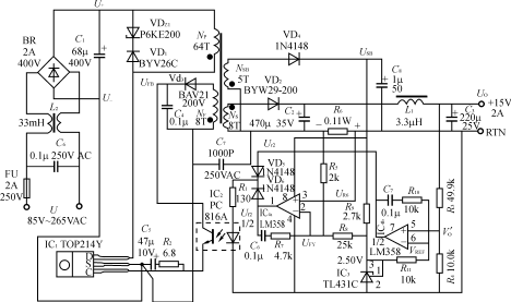 TOP102Y構(gòu)成的+15V、2A開關(guān)直流穩(wěn)壓電源電路,TOP102 POWER SUPPLY