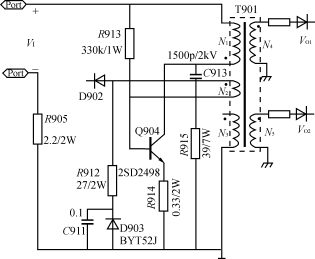 3609 BUJ101AU的雙極型功率開關(guān)晶體管,外形封裝為TO220AB,其驅(qū)動(dòng)信號(hào)來(lái)自于自激振蕩變壓器。該電路具有成本低和所用元器件數(shù)量少的特點(diǎn)。電路的正常交流輸入市電供電電壓范圍為200~250V,即使交流市電供電電壓