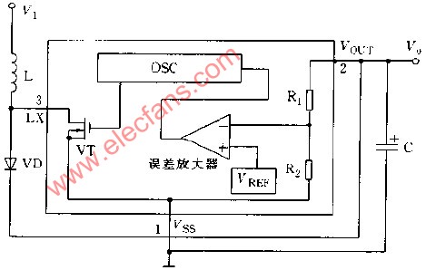 RH5RC內(nèi)部結(jié)構(gòu)框圖如圖所示,它由基準(zhǔn)電壓源Vrer,誤差放大器,控制晶體管VT,振蕩電路OSC以及輸出電壓設(shè)定電阻R1和R2等組成,