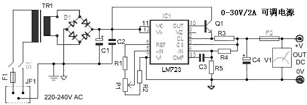 此電路用一片電壓調(diào)壓專用電路LM723(IC1)為核心,調(diào)節(jié)P1可實現(xiàn)輸出電壓從0-30V連續(xù)可調(diào),Q1為電流驅(qū)