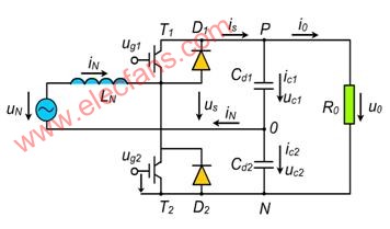 當(dāng)T1/T2按一定占空比導(dǎo)通時(shí),電路變?yōu)橐粋€(gè)Boost變換器,所以u(píng)o= uc1+ uc2>2 uNm