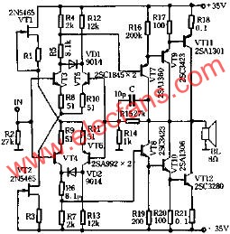 電路如圖4-1所示。元器件的選擇及安裝要求與一般全互補(bǔ)對稱功放一樣。應(yīng)注意的是,兩只三極管應(yīng)選用高頻二極管,或用高頻三極管的一個(gè)結(jié)代替。安裝時(shí)必須把VT1、VT2與功放VT11、VT12進(jìn)行熱耦合,以穩(wěn)定靜態(tài)電流。