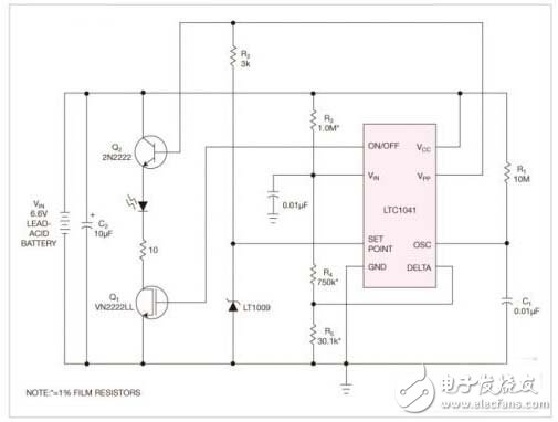 很多電池供電系統(tǒng)都需要一個可視指示器,用于指示何時需要更換電池。一般用LED做這種指示燈,但它們至少要消耗 10mA的電流。這個不小的電流會加速電池的放電,縮短電池的可用壽命。下圖使用了一種采樣數(shù)據(jù)技術(shù)降低了監(jiān)控電路的平均功耗。該電路的待機電流為 5μA,在指示低電壓時耗電為30μA。