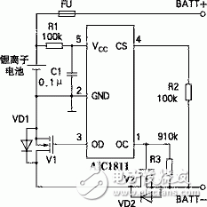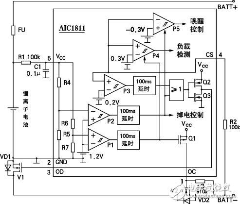 這里以AIC1811單節(jié)鋰離子電池保護器為例來說明保護器的電路及工作原理。該器件主要特點:終止充電電壓有4.35V、4.30V及 4.25V(分別由型號后綴A、B、C表示),充電電壓精度可達±30mV(±0.7%);耗電省,在3.5V工作電壓時工作電流典型值7μA,到達終止放電后耗電僅 0.2μA;有過充、過放、過流保護,并有延時以免瞬態(tài)干擾;過放電電壓2.4V,精度±3.5%;小尺寸5管腳SOT-25封裝;工作溫度范圍-20~ +80℃。