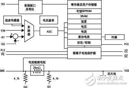 這里以DS2760為例說明該器件的特點、內(nèi)部結(jié)構(gòu)及應(yīng)用電路。該器件有溫度傳感器,能檢測雙向電流的電流檢測器及電池電壓檢測器,并有12位ADC將模擬量轉(zhuǎn)模成數(shù)字量;有多種存儲器,能實現(xiàn)電池剩余能量的計算。它是將數(shù)據(jù)采集、信息計算與存儲及安全保護于一身。另外,它具有外圍元件少、電路簡單、器件封裝尺寸?。?.25mm×2.75mm管芯式BGA封裝)的特點。