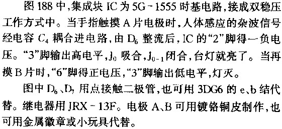 用555時(shí)基集成電路組成臺(tái)類觸摸開(kāi)關(guān),如圖中所示,圖示電路只要用手摸一下臺(tái)燈的金屬裝飾物,燈就亮;再摸另