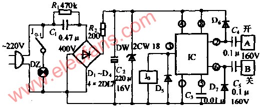 這里介紹的是用于臺(tái)燈的觸摸式開(kāi)關(guān)線路,使用時(shí),只要用手摸一下臺(tái)燈上的金屬飾物,燈就亮,再摸另一個(gè)金屬飾